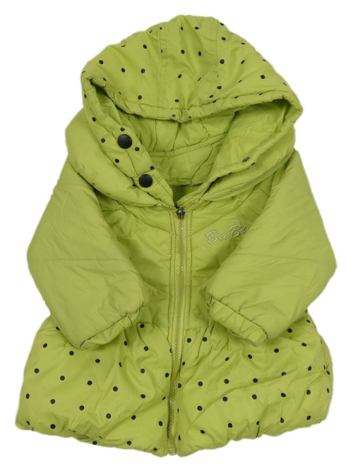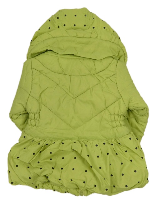Zelená prešívaná šušťáková zimná bunda s nápisom a bodkami a golierikom a odopínacíá kapucňou