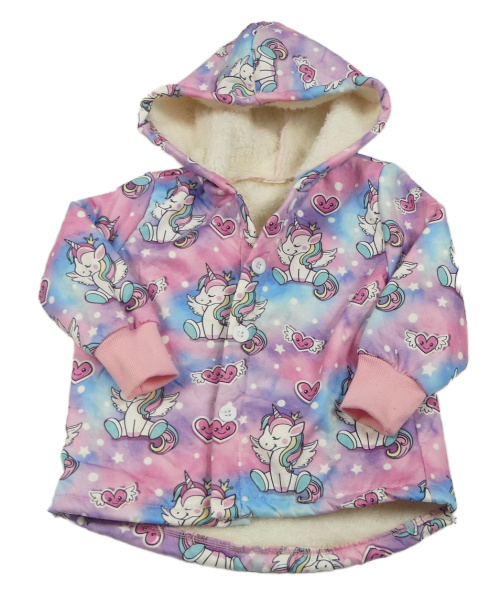 Ružovo-modrá šušťáková zateplená bunda s jednorožcami a kapucňou
