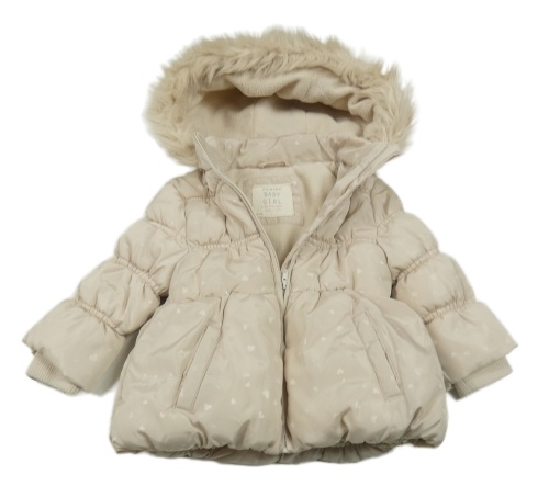 • Svetlobéžový prešívaný šušťákový zimný kabát so srdiečkami a kapucňou s kožešinou PRIMARK