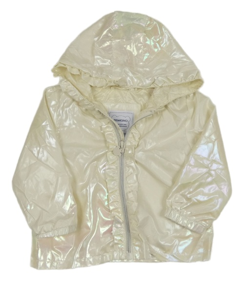 Smotanová trblietavá šušťáková jarná bunda s volánikmi a kapucňou