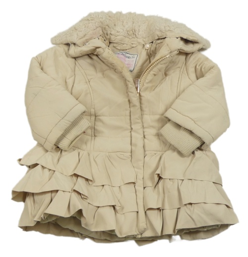 Béžový prešívaný šušťákový zimný kabát s volánikmi a huňatým golierikom Monsoon