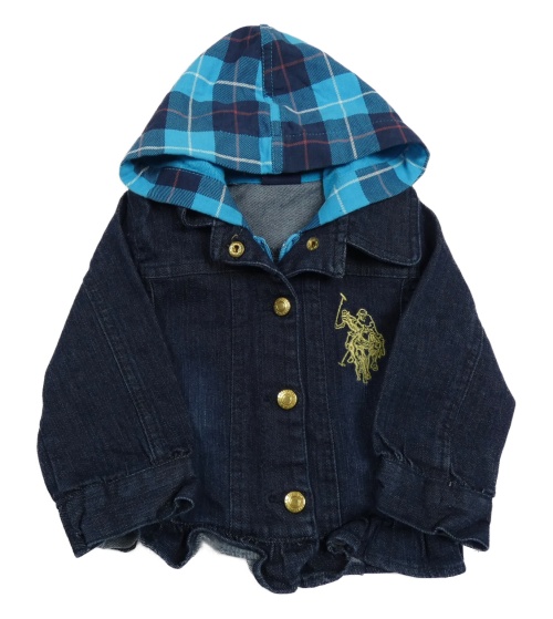 Tmavomodrá rifľová bunda s kockovanou kapucňou