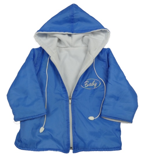 • Modrá šušťáková zateplená bunda s nápisom a kapucňou