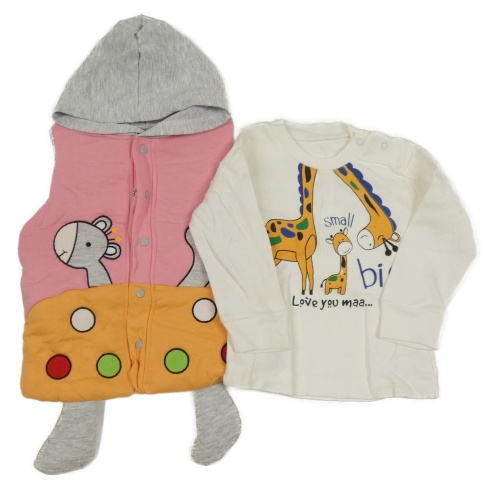 2Set - Ružovo-oranžovo-sivá prešívaná prepínaci zateplená tepláková vesta so žirafou a kapucí + biele tričko so žirafami