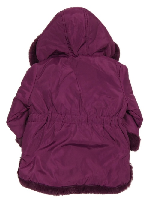 Slivková šušťáková zimná parka s kvietkami a motýlikmi a kapucňou a kožešinou St. Bernard