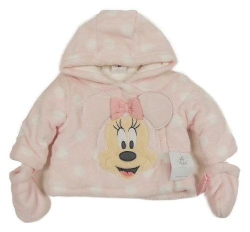 Nové - Svetloružová bodkovaná á chlpatá zateplená prepínaci bunda s Minnie a kapucí + rukavice Disney