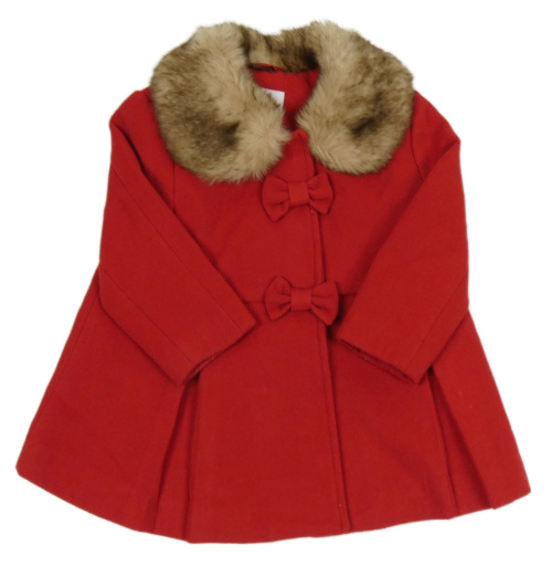 Červený flaušový podšitý kabát s mašľami a kožušinovým golierom F&F