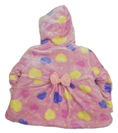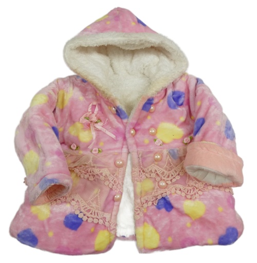 • Ružový bodkovaná ý plyšový zateplený kabát so srdiečkami a růžemi a čipkovymi volániky