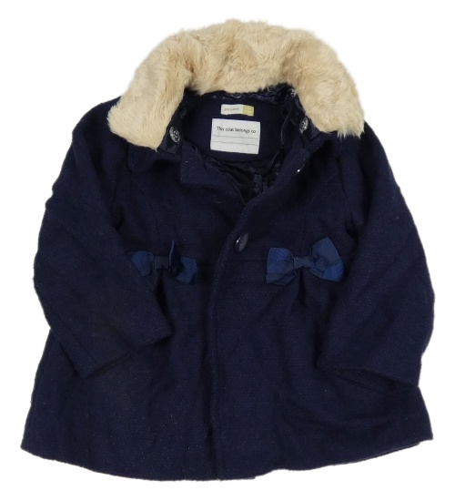 • Tmavomodrý vzorovaný vlnený podšitý kabát s mašľami a kožešinou John Lewis