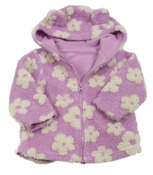 Lila-biela kvetovaná huňatá podšitá bunda s kapucňou s uškami St. Bernard