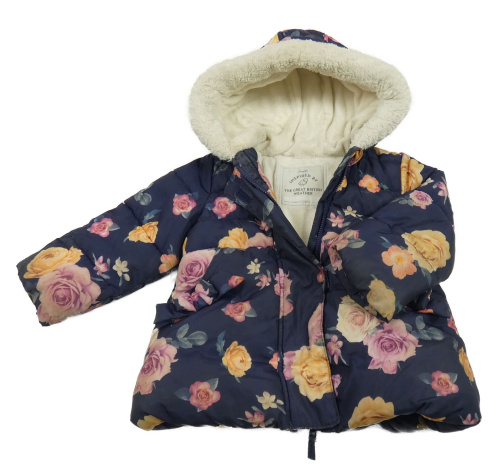 • Tmavomodro-farebná kvetovaná šušťáková zimná bunda s kapucňou s kožešinou George