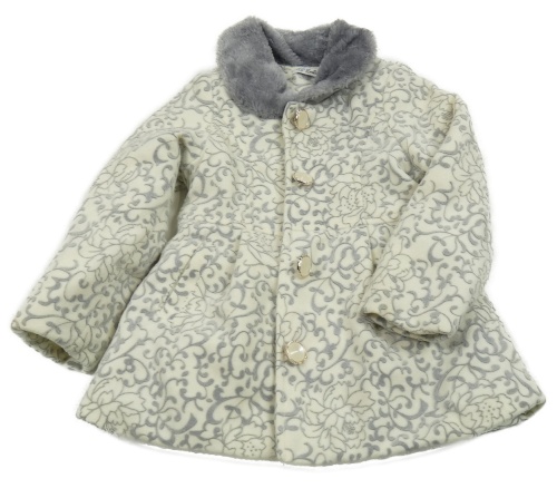 • Smetanovo-sivý vzorovaný zateplený kabát s kvietkami a kožušinovým golierikom