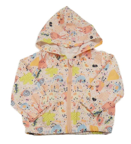Svetloružová bodkovaná á šušťáková ľahká bunda so zvieratkami a kapucňou