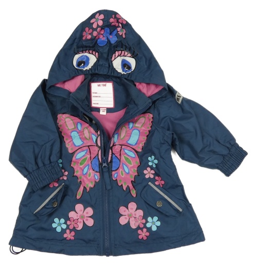 Tmavomodro-ružová šušťáková jarná bunda s motýlkom a kapucňou