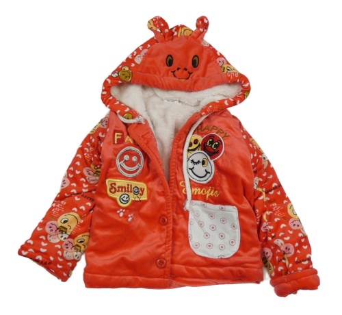 Červená plyšová zateplená bunda so smajlíkmi a kapucňou