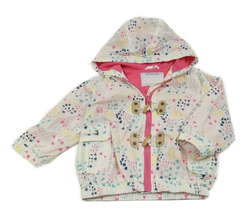 Bielo-farebná vzorovaná šušťáková jarná bunda s kapucňou Vertbaudet