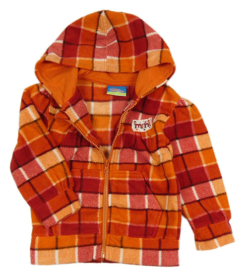 Červeno-oranžová kockovaná fleecová bunda s nášivkou a kapucňou Topolino
