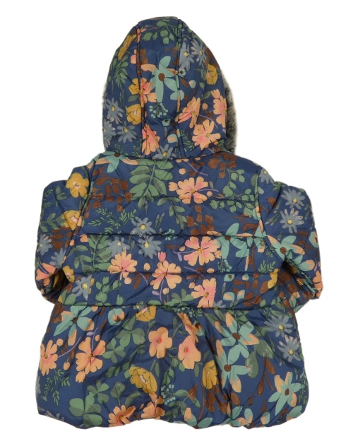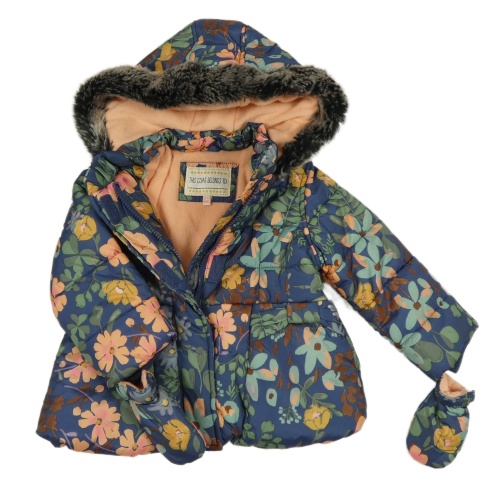 • Tmavomodrá prešívaná šušťáková zimná bunda s kvietkami a lístečky a kapucňou s kožešinou + rukavice M&S