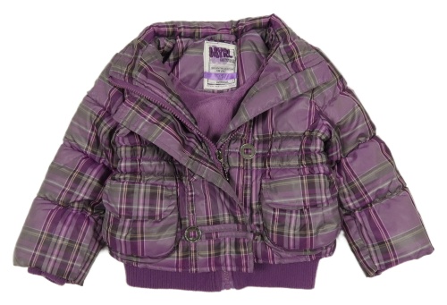 Fialovo-sivo-ružová kockovaná šušťáková zimná bunda Mayoral