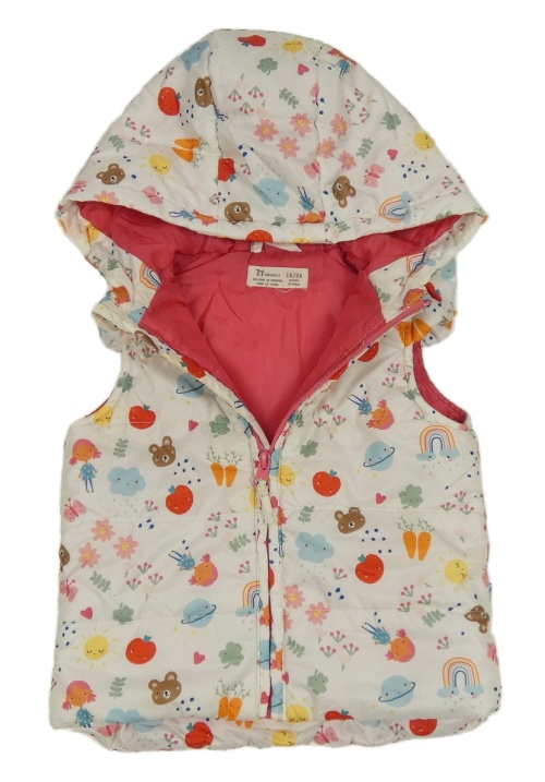 Bielo-farebná šušťáková zateplená vesta s obrázkami a kapucňou