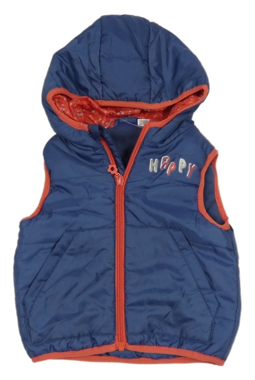 • Tmavomodrá šušťáková zateplená vesta s nápisem, korálovým lemem a kapucňou Lupilu