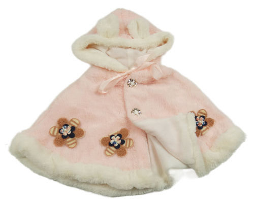 Ružovo-smotanové kožušinové pončo s kvety a kapucňou s uškami