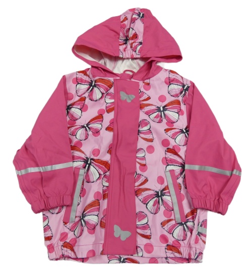 • Ružovo-tmavoružová nepromokavá bunda s motýlikmi a bodkami a kapucňou lupilu