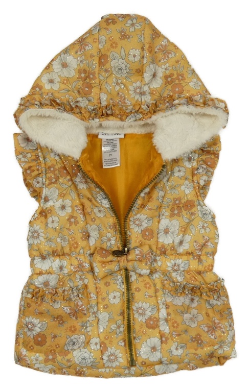 Okrová kvetovaná trblietavá šušťáková zateplená vesta s volánikmi a kapucňou