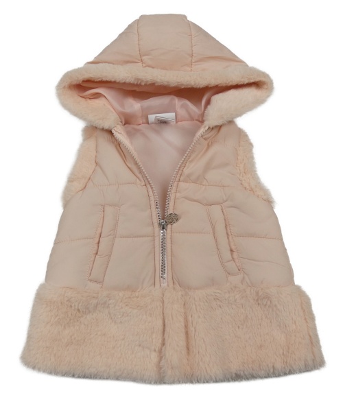 Svetloružová šušťáková zateplená vesta s kožešinou na kapuci