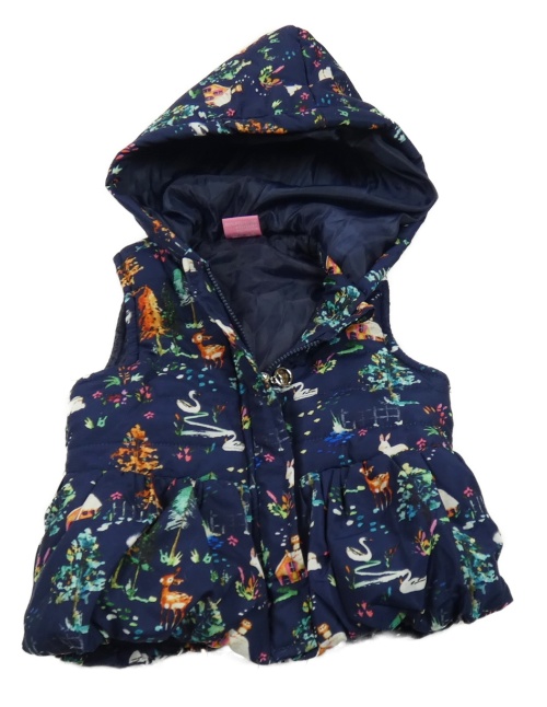 Tmavomodrá šušťáková zateplená vesta so zvířaty a kapucňou