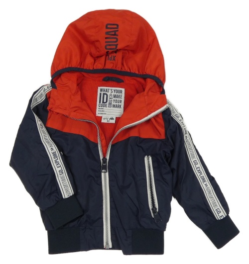 • Tmavomodro-červený šusťákový jarní bomber s nápismi a pruhom a kapucňou