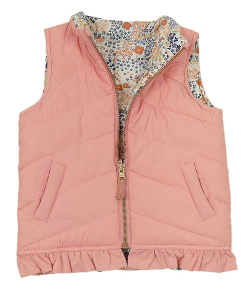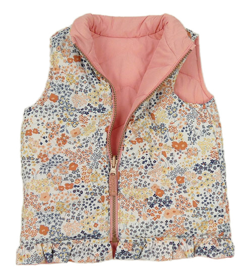 • Biela prešívaná šušťáková zateplená obojstranná vesta s kvietkami a volánikom