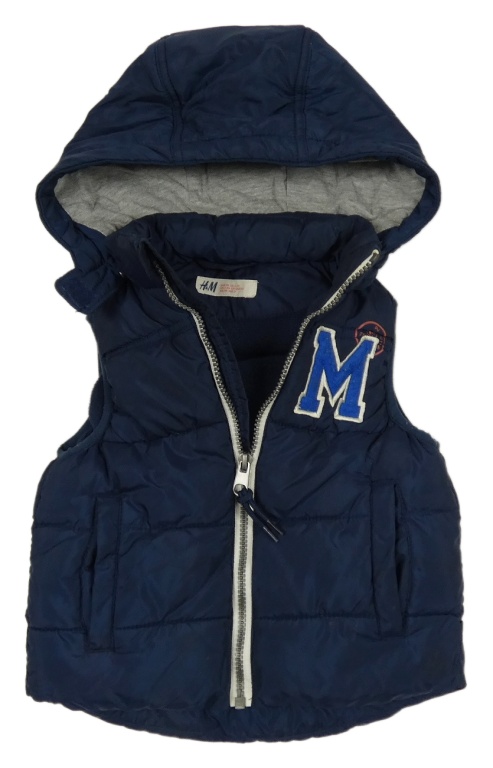 • Tmavomodrá prešívaná šušťáková zateplená vesta s písmenkom a odopínacíá kapucňou H&M