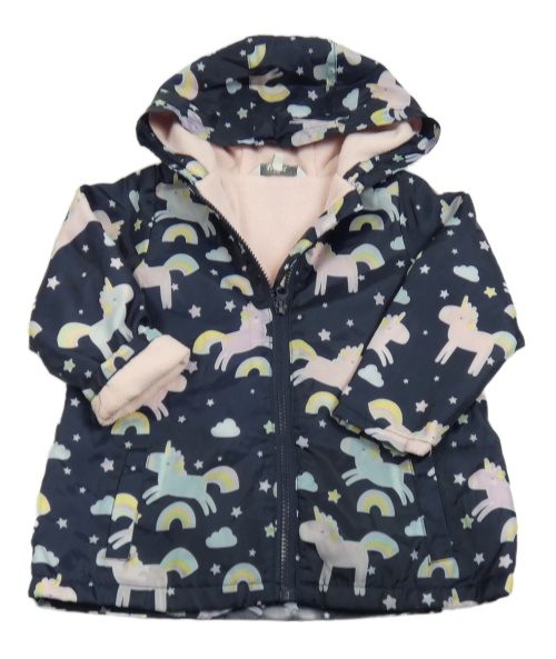 Tmavomodrá šušťáková jarná parka s jednorožcami a kapucňou