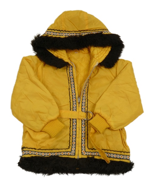 • Žlto-hnedá vzorovaná šušťáková lehce zateplená bunda s kapucňou s kožešinou