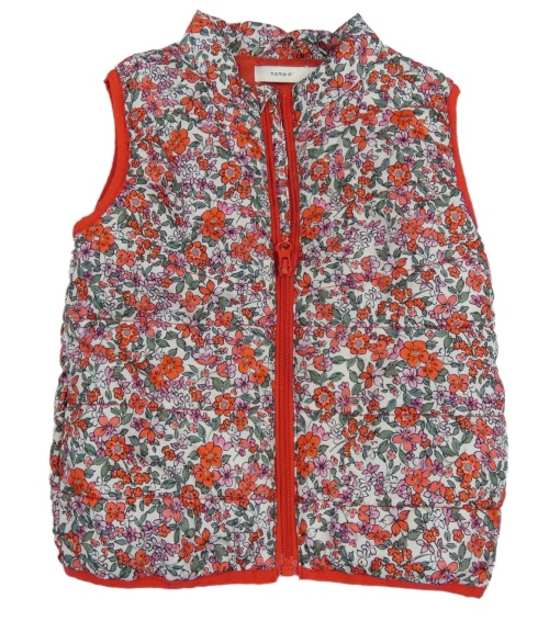 Bielo-červená šušťáková prešívaná zateplená vesta s kvietkami Name it