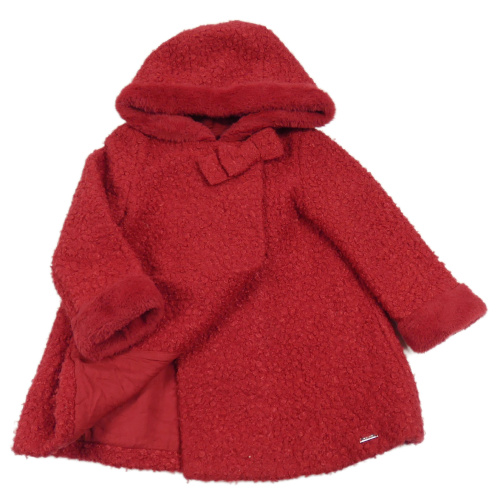 Červený huňatý kabát s kapucňou a mašlou Mayoral