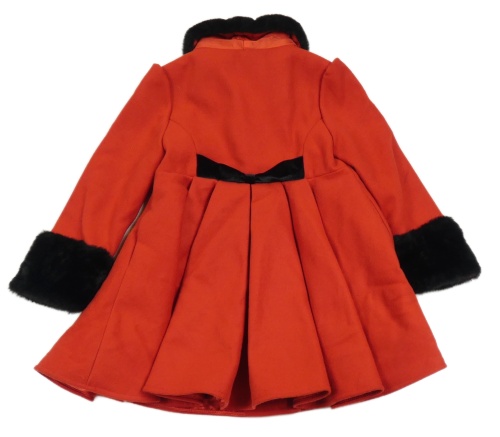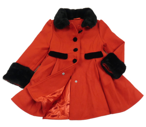 • Červený flaušový podšitý kabát s černou kožešinou a golierikom St. Bernard
