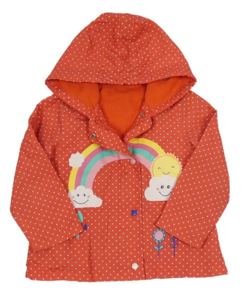 • Červená bodkovaná á šušťáková jarná bunda s dúhou a obláčikmi a kapucňou St. Bernard