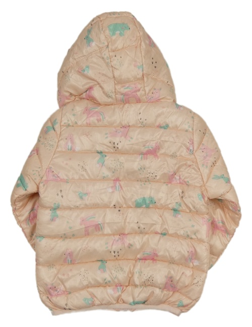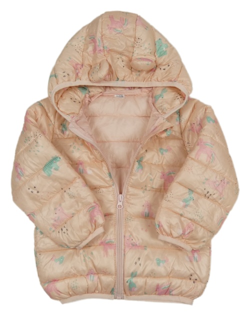 Broskvová šušťáková prešívaná zimná bunda so zajačikmi a kapucňou
