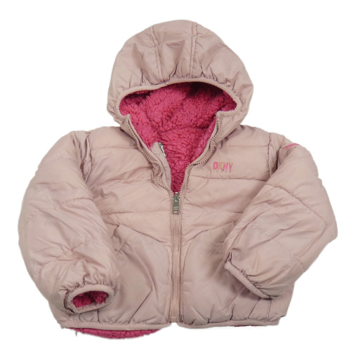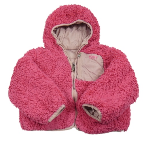 Tmavoružová huňatá zateplená obojstranná bunda s kapucňou DKNY