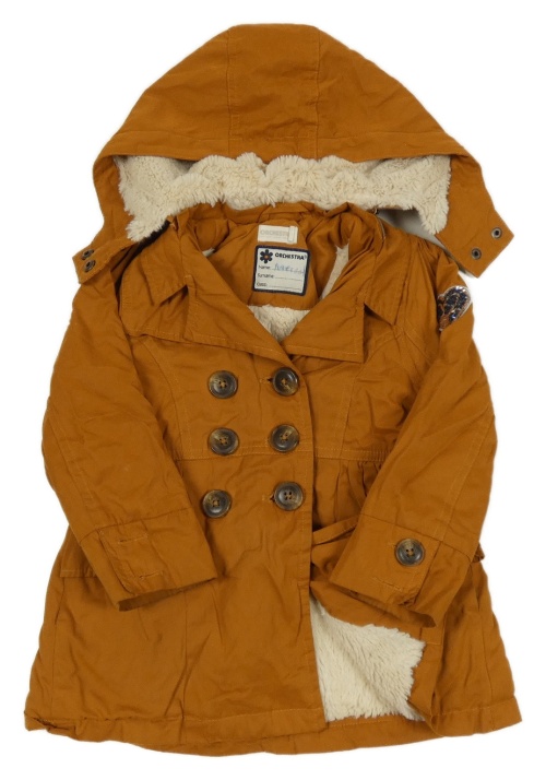• Medový šušťákový zateplený kabát so srdiečkom s flitrami a volánikom a odopínacíá kapucňou ORCHESTRA