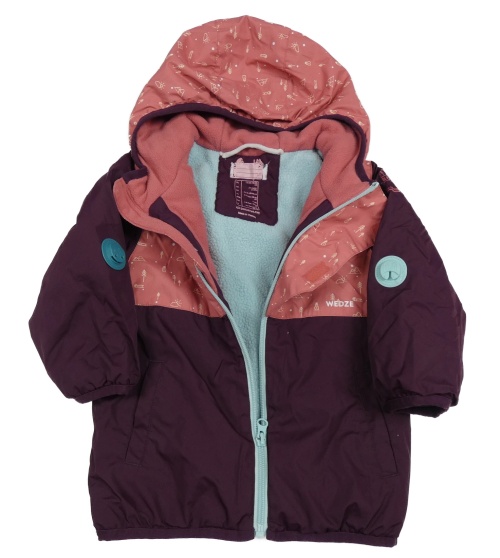 Fialovo-ružová šušťáková zimná bunda s obrázkami a kapucňou Decathlon