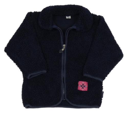 Tmavomodrá huňatá bunda s nášivkou a golierikom