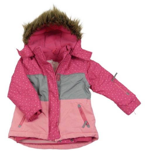 • Tmavorůžovo-sivo-ružová šušťáková zimná lyžiarska bunda so srdiečkami a kapucňou s kožešinou Topolino