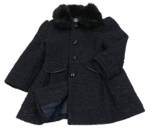 • Tmavomodro-čierny kockovaný trblietavý vlnený podšitý kabát s kožušinovým golierom F&F