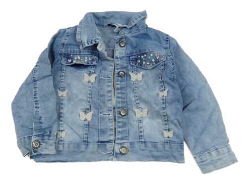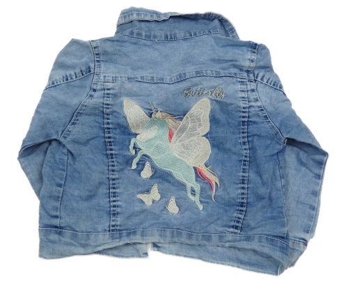 • Svetlomodrá šisovaná rifľová bunda s motýlikmi a kamienkami a perlami a jednorožcom