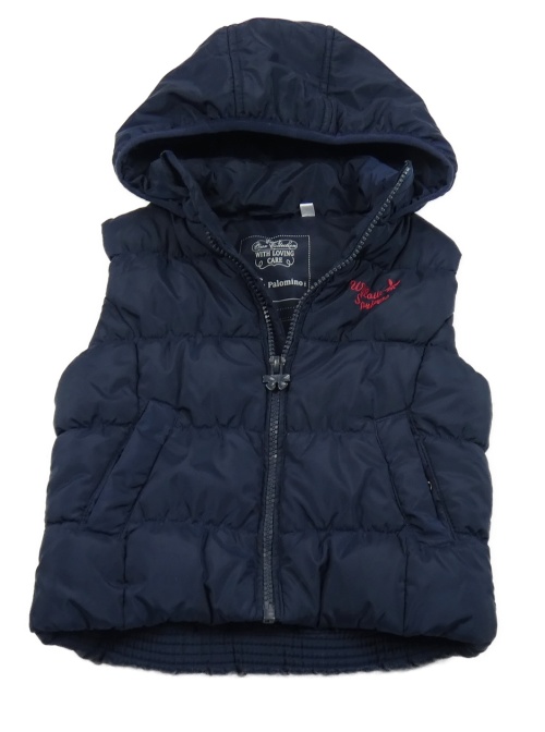 Tmavomodrá prešívaná šušťáková zateplená vesta s nápismi a kapucňou C&A