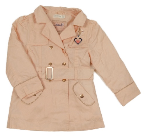 • Broskvový trblietavý šušťákový jarný zateplený kabát s vtáčikom a srdiečkom a golierikom a opaskom ORCHESTRA