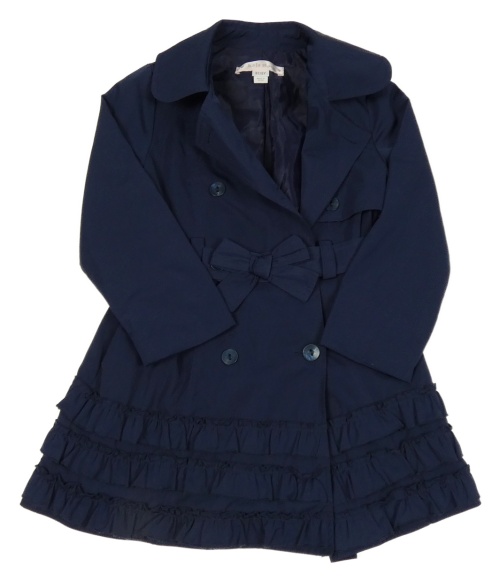 Tmavomodrý šušťákový jarný kabát s volánikmi a opaskom